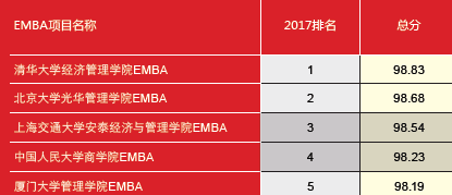 2017年10月,《经理人》杂志两年一度的“中国最佳EMBA排行榜”隆重揭晓:厦门大学EMBA再进一位,排名第五!这是前五名入选高校中唯一在北京、上海之外城市的大学。