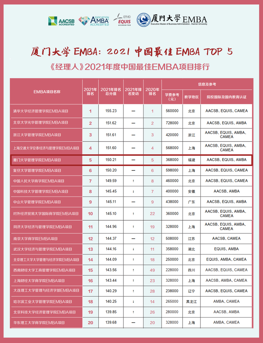 2021年10月,第十届“中国最佳EMBA排行榜”隆重发布。厦门大学EMBA再获殊荣,综合排名全国第五,其中单项“学员满意度”位居全国第一!
