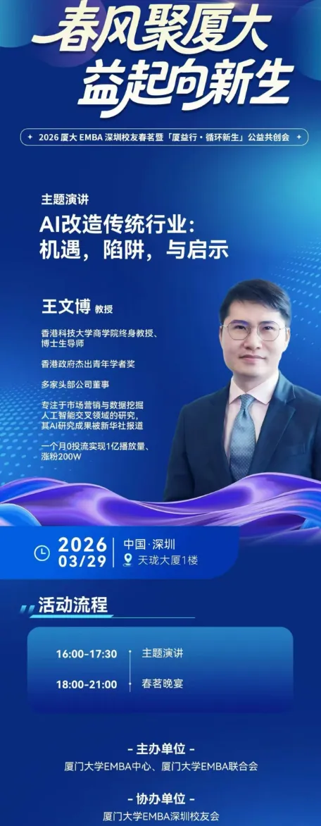 3月29日,厦大EMBA深圳校友会邀请香港科技大学终身教授王文博老师莅临,分享《AI改造传统行业:机遇、陷阱与启示》,并举办公益共创会。