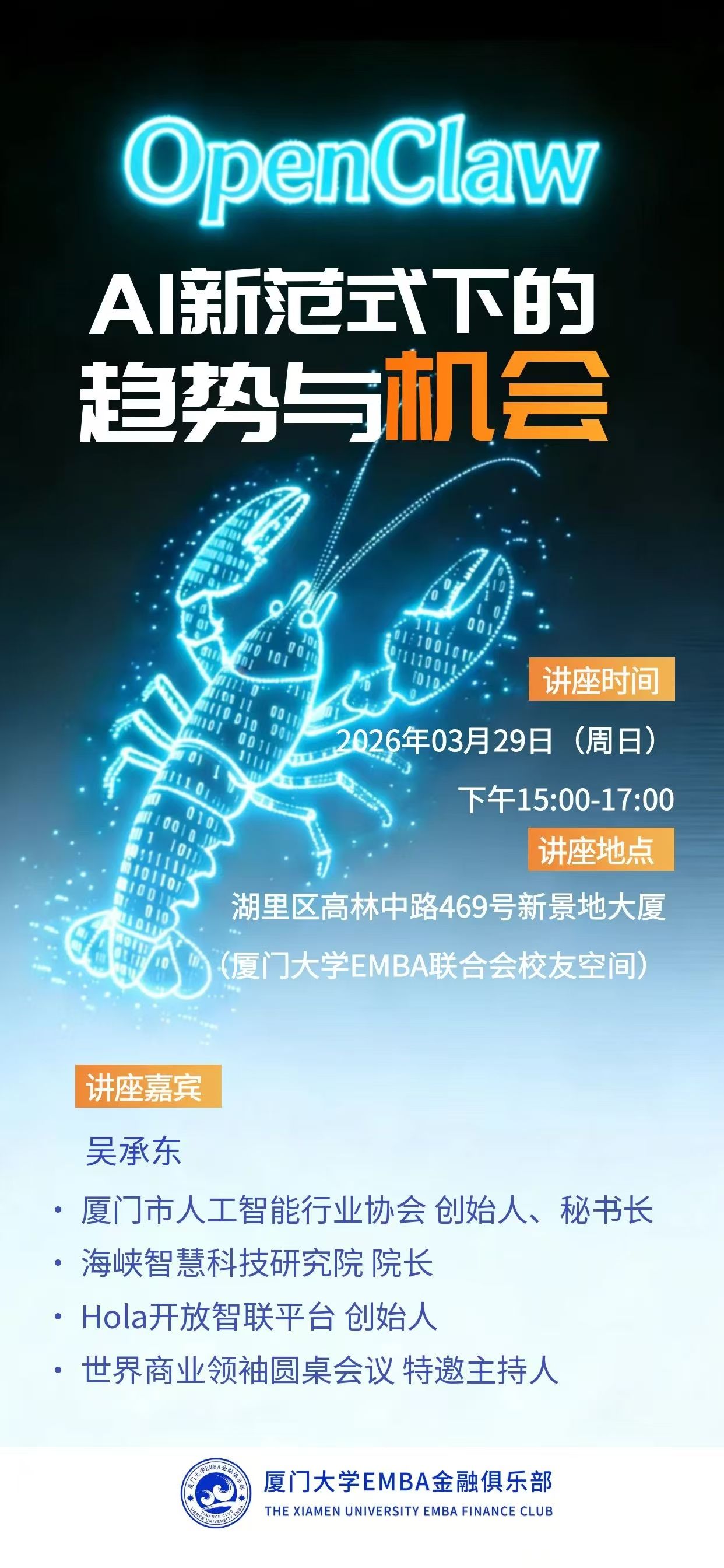 3月29日,厦大EMBA金融俱乐部即将举办《OpenClaw:AI新范式下的趋势与计划》,邀请厦门市人工智能行业协会创始人兼秘书长、海峡智慧科技研究院院长吴承东莅临分享,讨论如何在“龙虾热潮”中把握投资机会。
