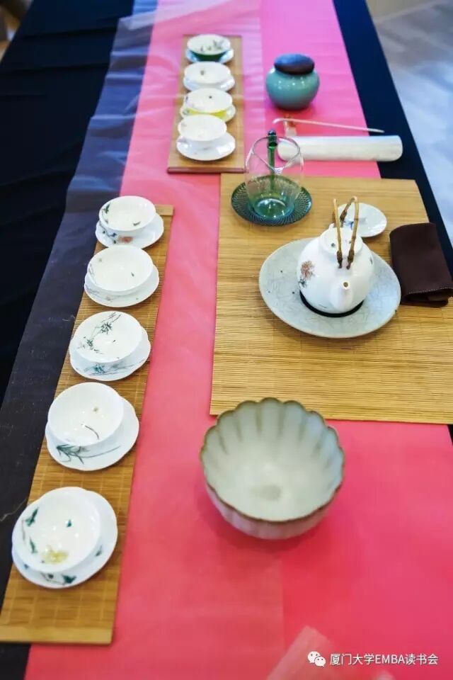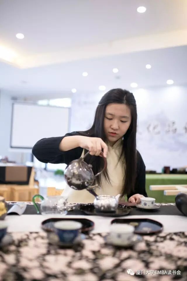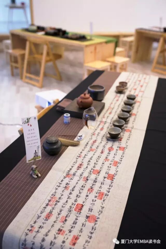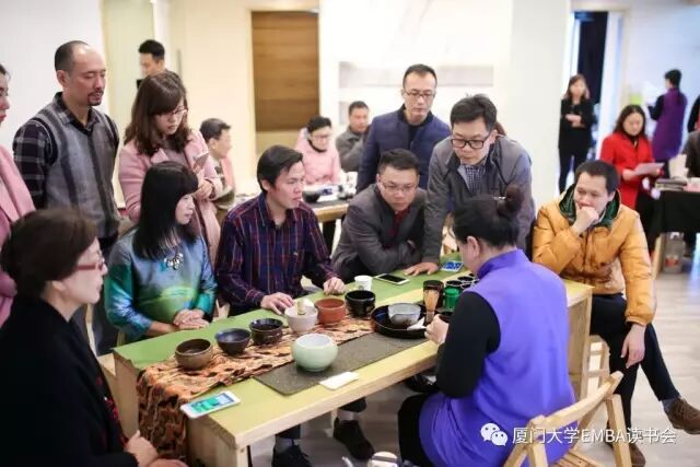 下半场开始,书友们自由组合到喜欢的茶席坐下,开始了关于茶的讨论分享。亚芬书友把自己前不久到日本参加了私宅茶会的经历分享给大家,那仪式那庄重给她留下了深刻的印象;云峰书友给老师同学们提出了问题:为什么茶艺在日本发扬光大成为茶道,而中国却没有?并推荐了宋徽宗的《大观茶论》;邱加彬书友说起喝茶和投资的关系;春哥从禅宗说起茶道,茶禅一味,最后还吟诵了一首茶诗。真是应了那句“茶逢知己品,诗向会者吟”。读书会就是聚集了一群喜好品茶吟诗的书友。