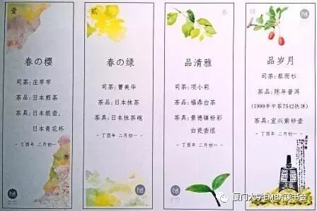 走进美习社,一下就会被无处不在的美所打动,进门签到桌上摆了一精美红色瓷钵,里面装有纸卷,抽出一条,展开细看你是哪个茶席,4个茶席名字也雅:春之樱、春之绿、品清雅、品岁月。各美其美、美美与共。拿着茶帖往里走,向右一拐是一间大教室,早已摆好四个茶席,寻到自己的那个席位坐下,身边是上天安排好的书友茶友,那也是缘分。