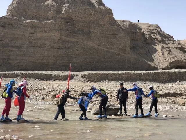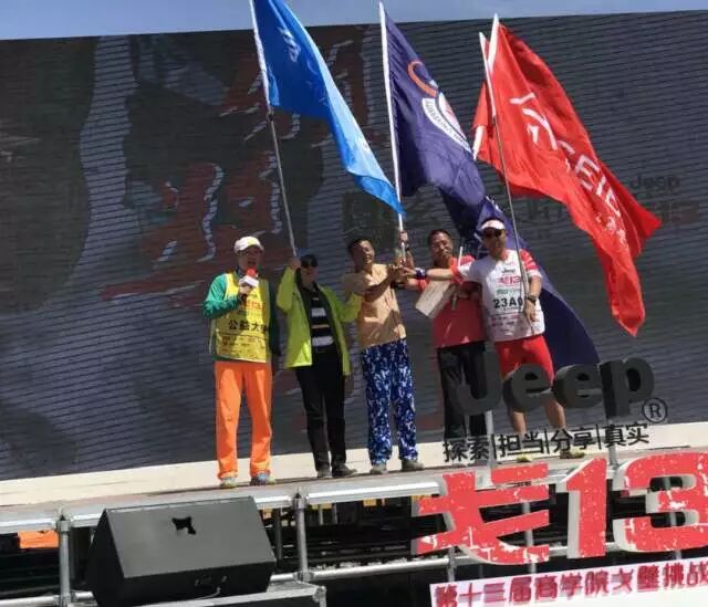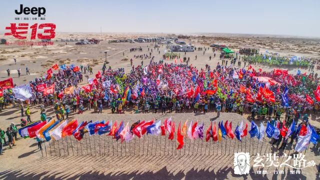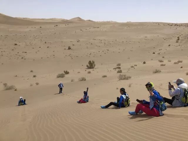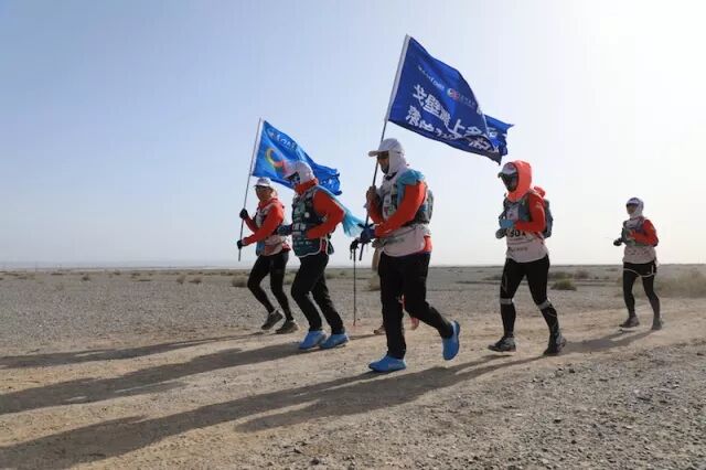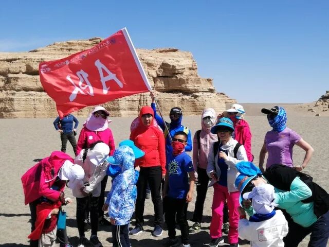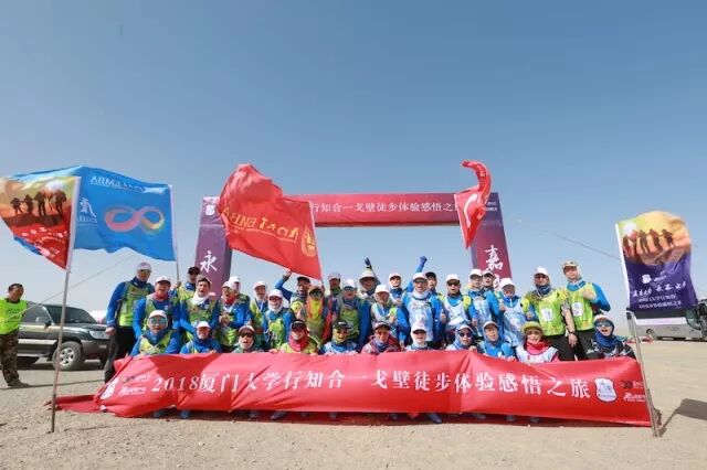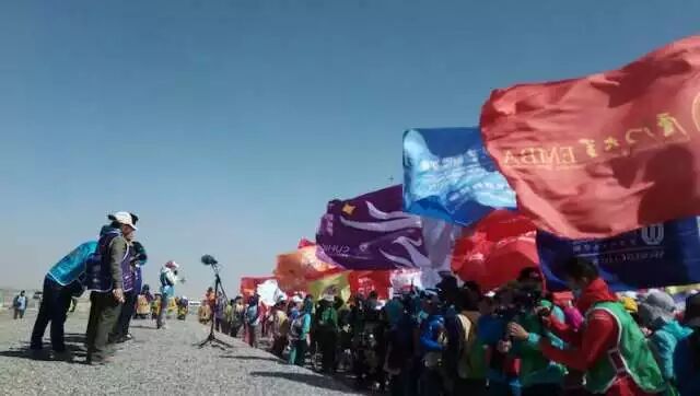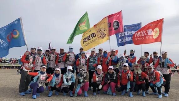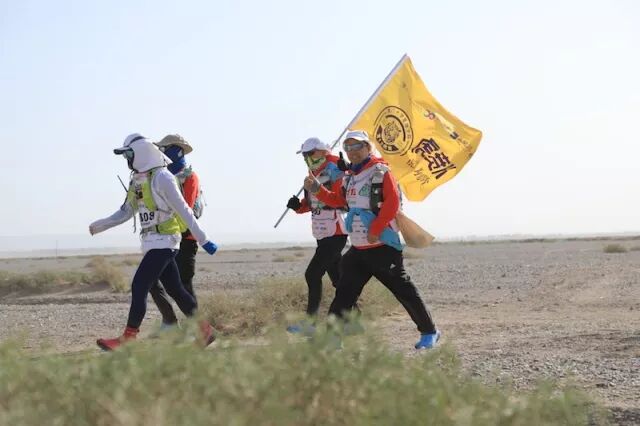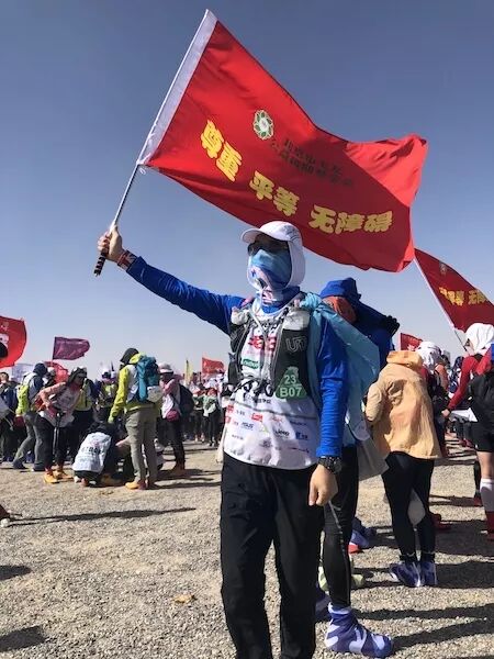 虎贲队队员每天扛着“戈壁滩上多朋友,落单和我一起走”的大旗,成为戈壁上一景,经常被要求拍照。